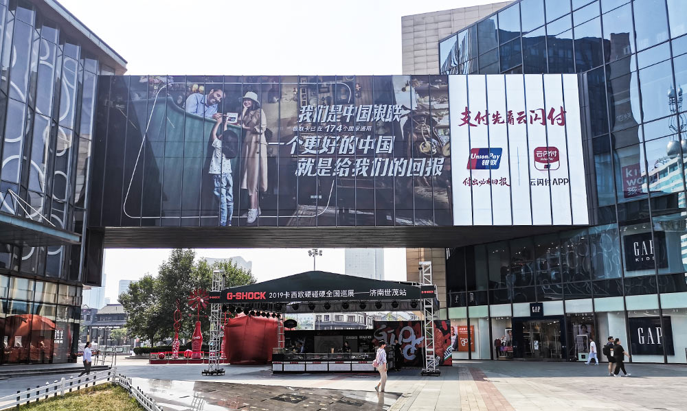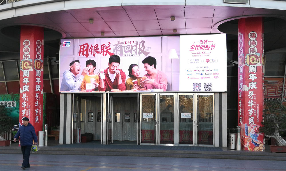 (中(zhōng)國(guó)銀聯投放“經十屏”銀座和諧廣場戶外LED屏廣告)