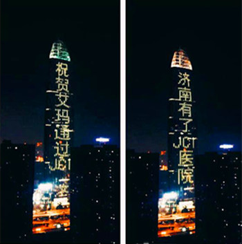 12月12日晚,濟南地标燈光秀綠地中(zhōng)心戶外LED廣告屏,突然被巨大的金色漢字所占據,大字緩緩呈現于樓身外牆:祝賀艾瑪通過JCI,濟南有(yǒu)了JCI醫(yī)院。300米的濟南第一高度,四面樓身均搭載巨大的屏幕,在濟南夜空中(zhōng)特别醒目,數公(gōng)裏之外仍清晰可(kě)見。
